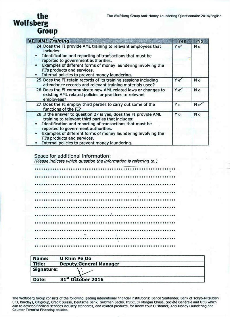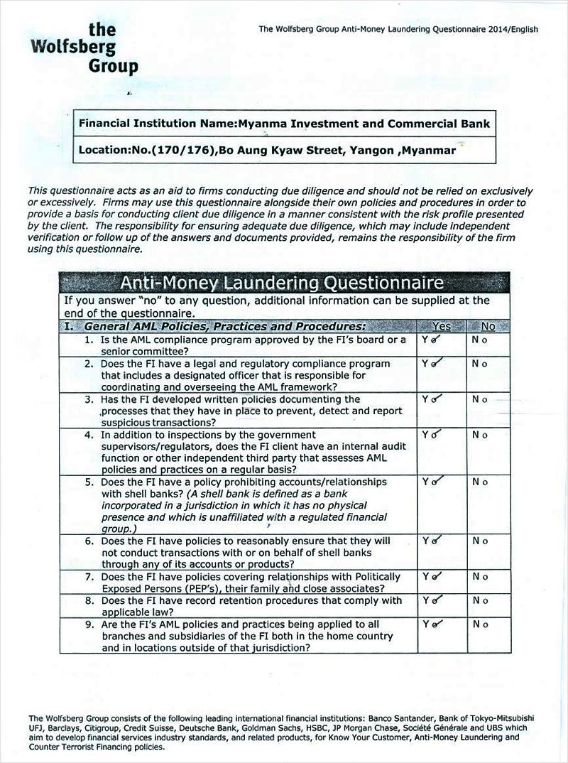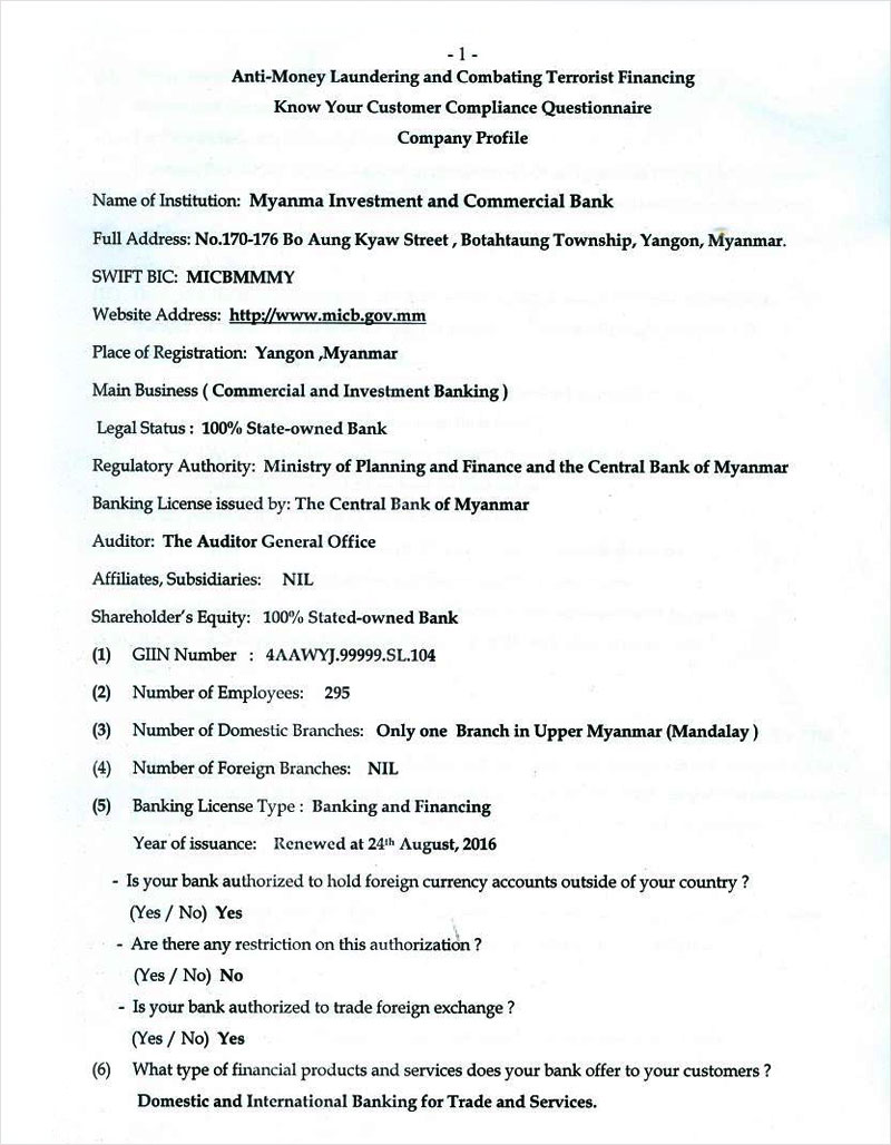 AML Questionaire of Myanma Investment and Commercial Bank is attached.